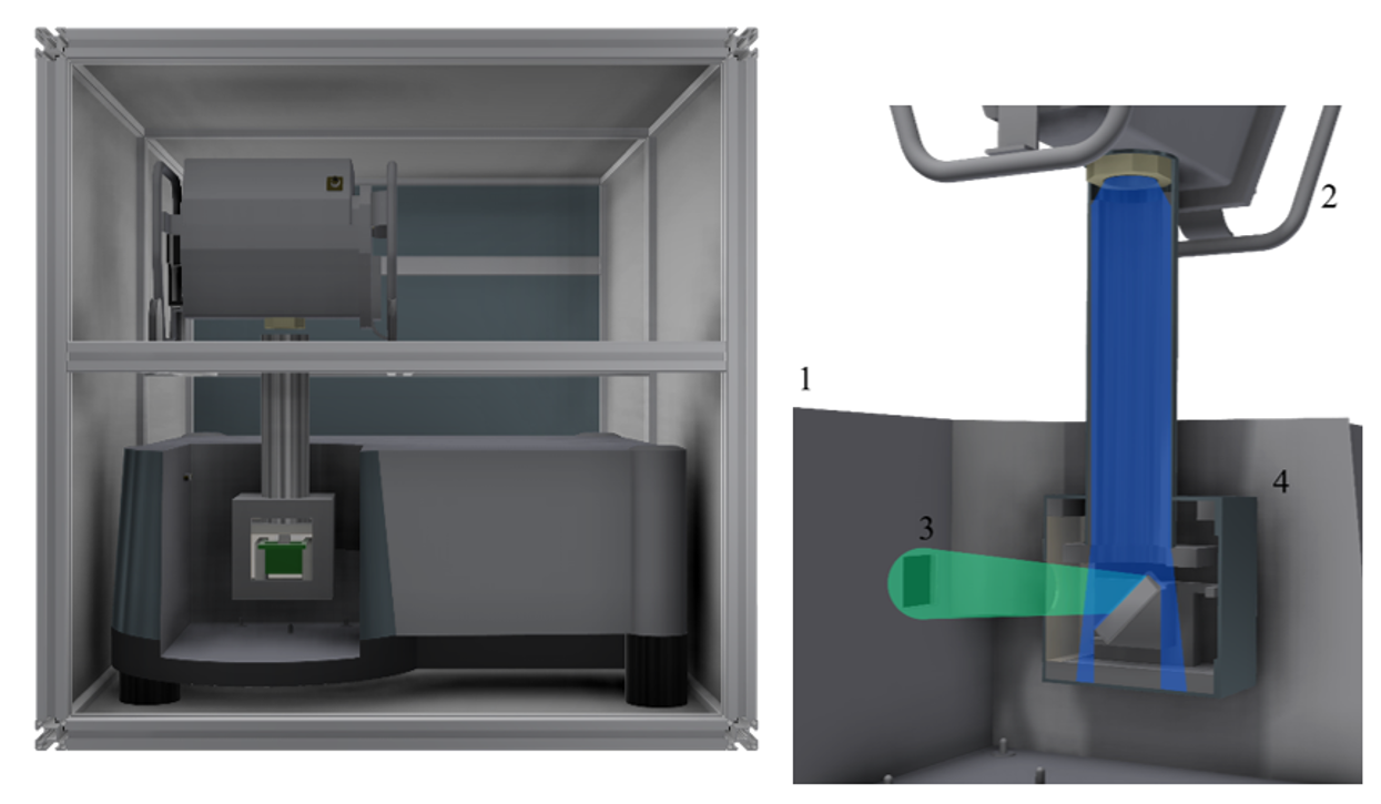 Установка состоит из рентгеновского источника – излучательной трубки и оптического флуоримéтра, который определяет концентрацию вещества. Принцип ее работы предельно прост: на образец падает рентгеновский пучок, после чего оптический сигнал, который генерируется исследуемым люминофором, попадает в область окошка детектора. Помимо исследования оптических свойств рентгеновских люминофоров установка также позволяет осуществлять контроль генерации активных форм кислорода.