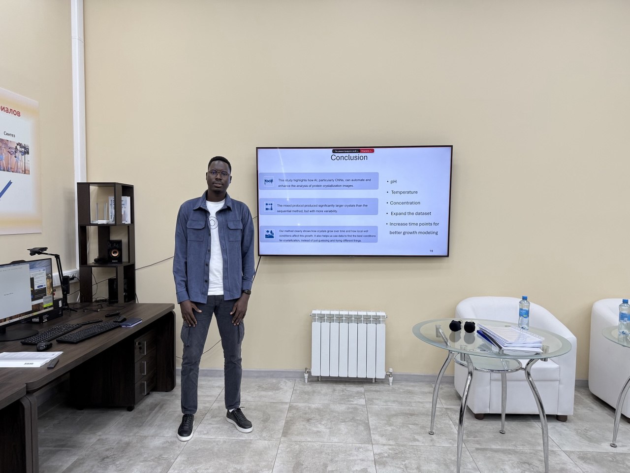 разработка и модификация гидрофобной фотополимерной смолы для печати микрофлюидных чипов; кристаллизация белков в проточных системах; моделирование адсорбции молекул CO на металлах с использованием машинно-обучаемых потенциалов; применение синхротронных in situ исследований для контроля роста НЧ платины; а также применение больших языков моделей для парсинга и анализа научных статей по определенным тематикам.